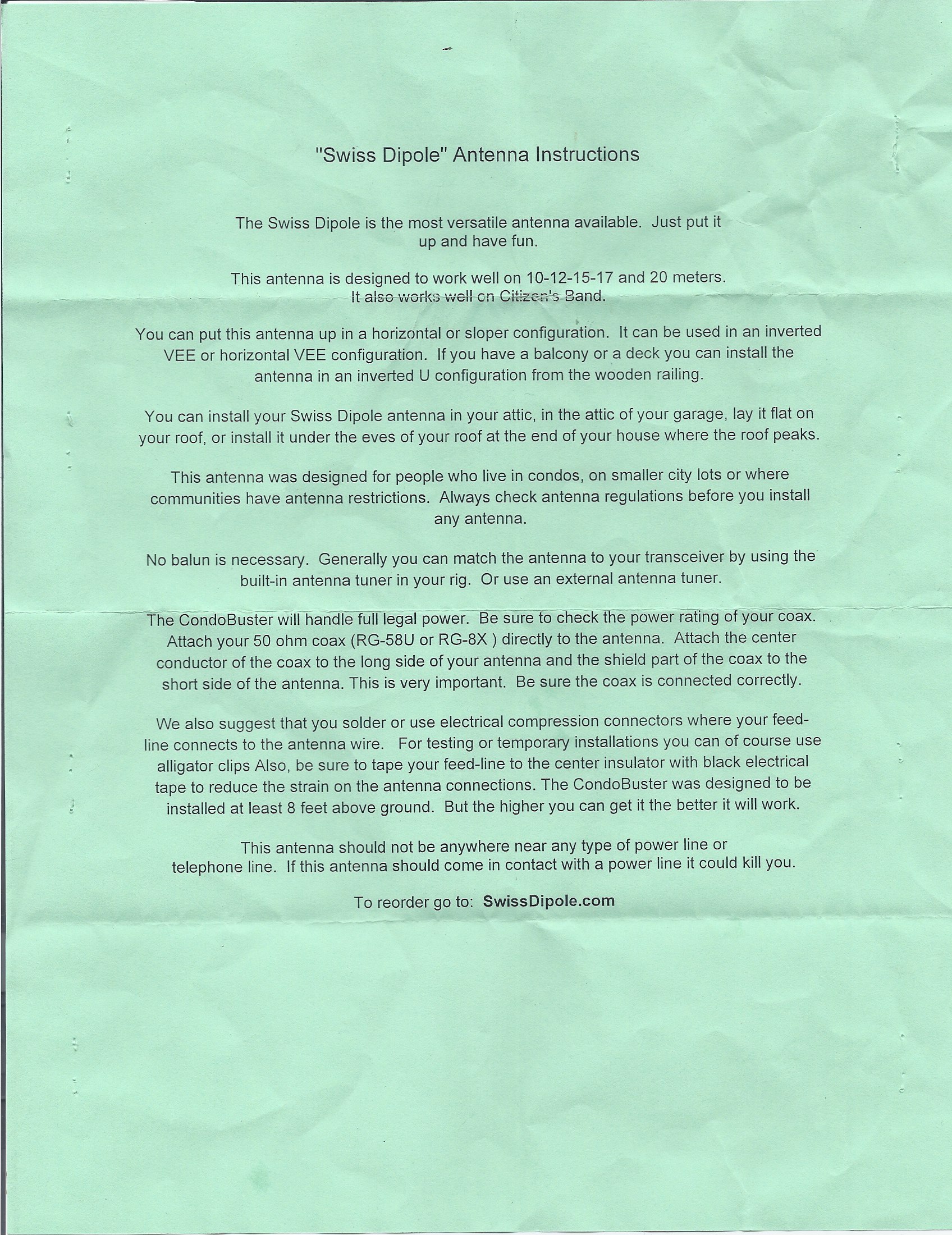 The Swiss Dipole is just 37 feet long and that makes it the perfect HAM Radio, Shortwave Listening or CB antenna for people living in condos, on smaller parcels of land or in antenna restricted areas.